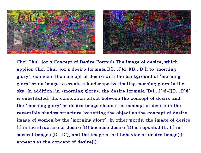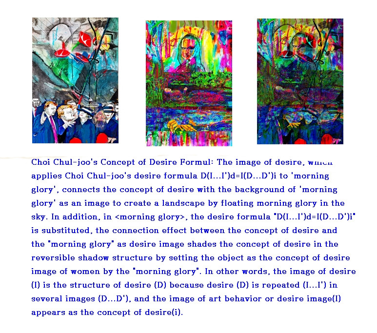 ■ Choi Chul-joo's concept of desire, "morning glory," conflicts with linguistic concepts of meaning emphasized from a metaphysical philosophical point of view, creating dramatic event images to express the subject of insufficient desire, and illuminating the image in reversible shades of white light. He reflects the linguistic grammatical meaning of abstract desire concepts as images to form spaces of multiple event images that share superimposed temporality and reversible white light shades. This is interpreted as the subject of the absence of desire beyond the abstract self of the desire of others rather than physical perception, unlike the materialism of painting in the 18th century. The linguistic grammatical meaning of abstract desire concepts is a dualistic object that regards real images as events, equating the structure of insufficient desire with the principle of spatial composition. And as reversible light at the point of light over time, the material is made into a real image as an object. Thus, the concept of abstract desire in a pond that reflects the image of an event is expressed as a real image that reflects the desires of others in the real world. ■ Choi Chul-joo's Concept of Desire Formula: In the concept of Choi Chul-joo's desire, mathematical desire as an axiom of logic in the concept of desire results in reality as a concrete phenomenon rather than based on the external structure of the linguistic meaning through abstract design. Therefore, the rendering of the desire structure revealed by abstract encounter with reality at the intersection of desire outside the window applies the mathematical desire concept abstract design, or the image of the desire concept, to the Choi Chul-joo desire formula, and on March 1, 2022, morning glory appears as a flat real image as the subject of desire as a reversible shade of light in the Flushing Town Hall (New York) exhibition./ The image of desire, which applies Choi Chul-joo's desire formula D(I...I')d=I(D...D')i to 'morning glory', connects the concept of desire with the background of 'morning glory' as an image to create a landscape by floating morning glory in the sky. In addition, in <morning glory>, the desire formula "D(I...I')d=I(D...D')i" is substituted, the connection effect between the concept of desire and the "morning glory" as desire image shades the concept of desire in the reversible shadow structure by setting the object as the concept of desire image of women by the "morning glory". In other words, the image of desire (I) is the structure of desire (D) because desire (D) is repeated (I...I') in several images (D...D'), and the image of art behavior or desire image(I) appears as the concept of desire(i). ■ Choi Chul-joo's Desire The design process of abstract concepts: 1. The concept of desire is abstracted from the perspective of an image to the outside of reality, and the image of reality as an object of abstraction is designed as the correlation between reality and reality. This is the design process 1 of Choi Chul-joo's concept of abstraction of desire. This does not presuppose a causal relationship with the real world, but rather results in an abstract concept of desire as a correlation with reality to escape the misunderstanding that transfers from an abstract concept to a real structure. 2. The scope of showing the concept of desire is created and located by omitting the actual size of the abstract concept as a shade of the concept of desire originating from the actual image. In addition, Choi Chul-joo's conceptual process 2 follows the process of decorating an object with a color of universal reality suitable for custom in order to have aesthetic value suitable for its position as a single image. This creates an abstraction that contrasts with the past and desire, in which the aesthetic structure hidden by realistic colors is divided by clouds and obscured by shaded light, obscuring the abstract concept in the actual image. 3. The subject who painted abstraction realizes the reality that symbolizes the concept of desire, and the unconscious realizes abstract desire as a conscious phenomenon of image. Desire is an abstract image realized as a conscious phenomenon of an image, and the unconscious structure is process 3 of designing an abstract art concept of desire that repeatedly designs desire that combines line and color in thoughts but is not conscious of unconscious behavior. 4. The unconsciously abstracted concept of desire is a piece of reality in which the object of reality is not seen as a reversible shade of light, concealing reality as a shadow and showing another real image as a video. This is the process 4 of designing an abstract concept of desire formed by combining the space of desire into a reversible light structure through the conscious movement of planar monochromatic painting carved into reality. ■ The Design Results of Choi Chul-joo's Desire Abstract Concept: Choi Chul-joo Desire Abstract Concept Design's Linguistic Meaning Results: Although the object that is obsessed with the desire for others is passive, it is possible to actively practice one's desires through the sympathizer as the subject of desire, and the sympathizer who sympathizes with the desires of others as the subject can practice with the same desire. As a subject, a person who sympathizes with or accepts the desires of others becomes the same desire and becomes another subject of execution. Here, the sympathizer who sympathizes with the subject of the other's desire tries to generalize it as another object of desire that acts like a victor of war. However, when desire as an act overshadowed by reversible light is not generalized as a public act, the subject of inappropriate desire and the sympathizer antagonize the subject who practiced it according to the other's general desire. ■ Object rendering of the concept of desire is 1. a pop art image that renders unconscious desire as an existential reality by dividi