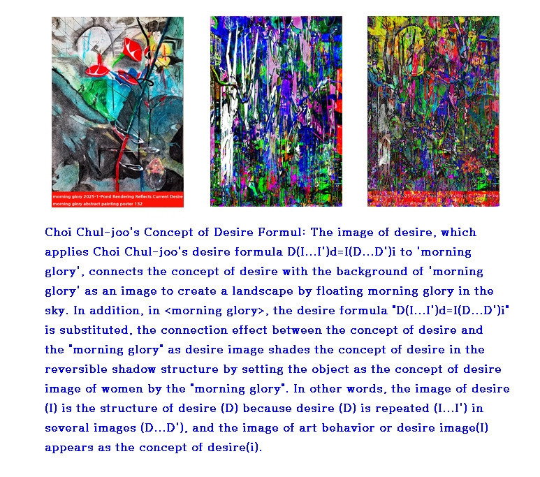 Desire Design Methodology in Abstract Art Theory on Painting Design, Contemporary Artist Choi Chul-joo's Desire Concept Abstract Design Methodology: <morning glory p132-3-Chungha, shows outstanding performance> As an Abstract Korean painting of Modern Art, Desire Formula <D(I...I')d=I(D...D'i)i> is applied to overlap the painting <Louis Chul-joo Choi, morning glory 2025-1-Pond Rendering Reflects Current Desire, 113X164cm, acrylic and composite materials on cloth, 2025> created by reversible light. In addition, by re-applying the desire formula by linking verbal metaphor images, a phenomenal conceptual place is set in another place in one space as a shade of reversible light and abstracted.