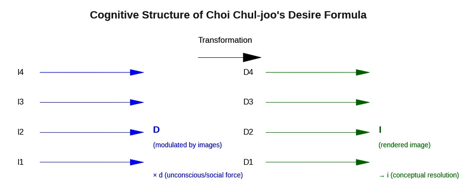 Choi Chul-joo’s desire formula D(I...I')d=I(D...D')i an be visualized as a dynamic vector field, where each component represents a transformation in the structure of desire: