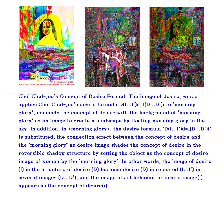 최철주의 욕망 공식 D(I...I')d=I(D...D')i 이 ‘나팔꽃’ 이미지에 적용될 때, 이는 욕망의 개념과 ‘나팔꽃’이라는 배경 이미지 사이의 연결을 통해 하늘에 나팔꽃을 띄움으로써 하나의 상징적 풍경을 창조하는 시각적 구조로 작동하며, 이 공식은 단순한 시각적 재현을 넘어 욕망의 구조를 반복적 이미지와 상호작용하는 수학적·인지적 체계로 정식화하는 방식으로 이해될 수 있다. 특히 작품 <morning glory>에서는 욕망 공식이 대입되어, 욕망 개념과 ‘나팔꽃’이라는 욕망 이미지 사이의 연결 효과가 가역적 그림자 구조 속에서 욕망 개념을 음영 처리하며, 여기서 ‘나팔꽃’은 여성의 욕망 이미지 개념으로 설정된 객체로 작동한다. 다시 말해, 욕망의 이미지(I)는 욕망의 구조(D)를 구성하는데, 이는 욕망(D)이 여러 이미지(I...I') 속에서 반복되며, 그 이미지들이 다시 욕망의 구조(D...D')를 반영하기 때문에, 예술적 행위의 이미지 또는 욕망 이미지(I)는 결국 욕망 개념(i)으로 출현하게 되며, 이러한 구조는 라캉의 ‘타자의 욕망’과 프로이트의 ‘무의식적 반복’ 개념을 시각적으로 구현하는 동시에, 인간 인지가 욕망을 어떻게 상징적 구조와 반복적 이미지 속에서 구성하고 인식하는지를 보여주는 인지 공학적 시뮬레이션으로 해석될 수 있다.