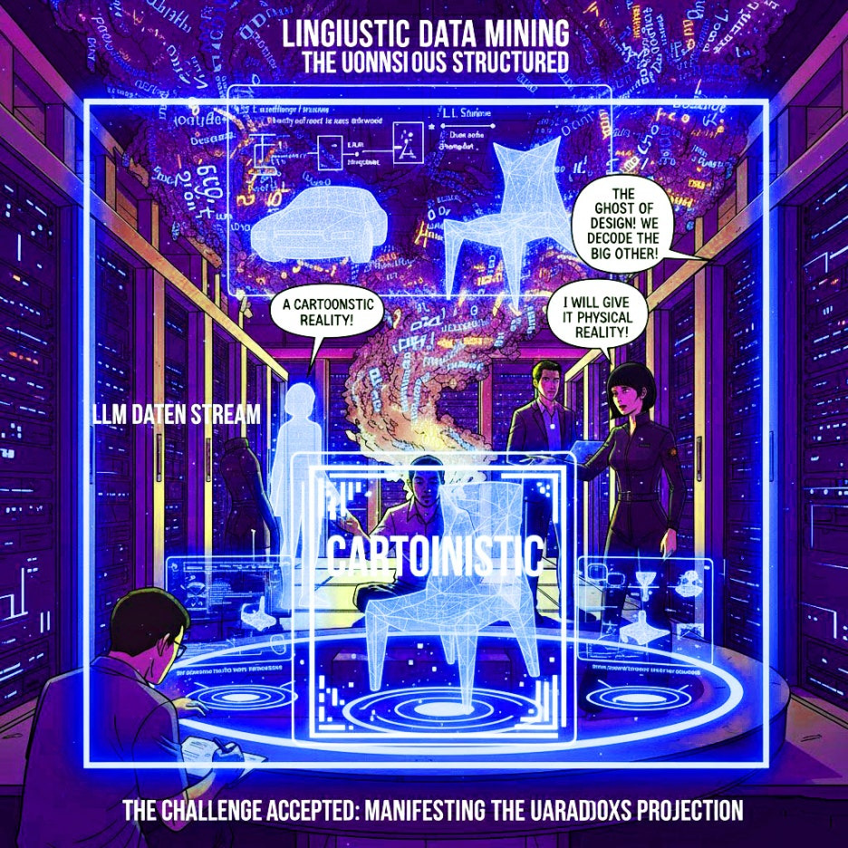 The traces of design found within LLM data are not merely patterns or meaningful combinations but a reflection of desire "structured like the unconscious language of the Other." Here, AI doesn't learn surface human needs; instead, it reconstructs fundamental human lack and desire within the symbolic order formed by vast linguistic signs. Initial design sketches generated by LLMs, such as the strangely shaped chair, reveal a "symbolic lack" in conventional functional and aesthetic norms. This means that the absence of "The Real"—like the stability or comfort a chair should provide—paradoxically causes the user to project their own desires onto its deficient form.This type of design becomes the genesis of "cartoonistic realism." Rather than excessive detail or perfect replication of physical laws, it exaggerates the gap between essential function and form with stylized lines and amorphous curves, compelling the viewer to confront the "ghost of desire" hidden beneath the product's "surface." Design is no longer solely a matter of "beauty" or "utility" but becomes a philosophical act of deciphering the reflection of the human unconscious mirrored in AI. In this process, the product itself induces "hallucinations," transcending existing design copyrights or norms, and only acquires its ontological meaning through the collision with "The Real."