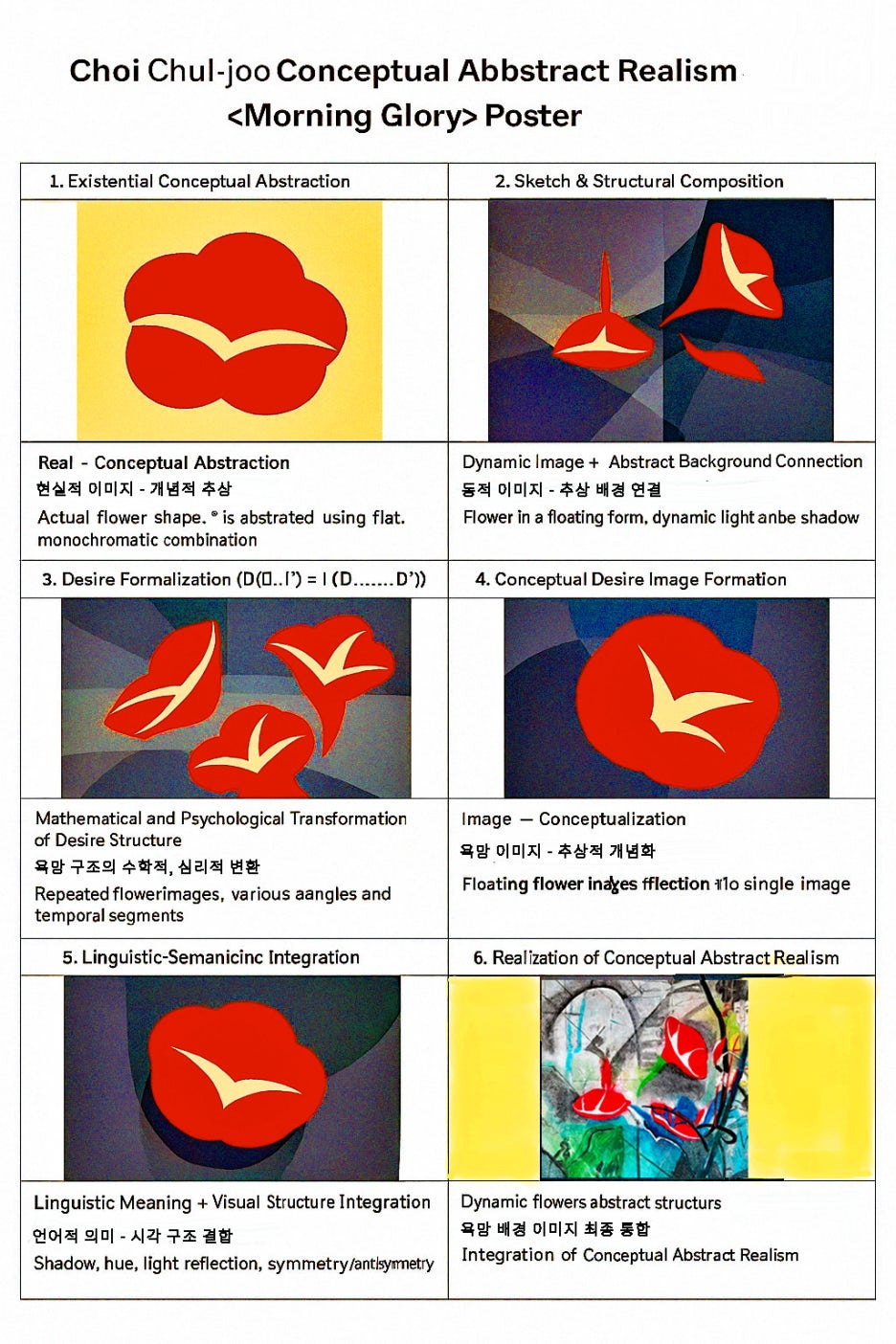 7. Applying Choi Chul-joo’s conceptual abstract realism design methodology to the visualization of desire in Louis Choi Chul-joo’s Morning Glory, at the initial stage of existential conceptual abstraction, the realistic elements of the morning glory are abstracted into a conceptual object that embodies desire, where this abstraction functions not merely as a visual reproduction but as a cognitive apparatus translating the inherent lack of desire into a perceivable visual structure, allowing the viewer to recognize the recursive interplay between the object of desire and the symbolic structures that govern it; in the subsequent stage of sketching and structural composition, the dynamic images of the morning glory are linked to the abstract background through reversible light and segmented temporality, generating a visual grammar in which the phenomenological movement of the image interacts with the static abstraction of the background, thereby extending linguistic meaning into visual form and revealing the unconscious mechanisms through which desire is produced, mediated, and repeated; following this, at the stage of desire formalization, the formula D(I…I’)d = I(D…D’)i is applied so that the morning glory simultaneously functions as object, image, and conceptual abstraction, where the sequential arrangement of repeated visual instances reflects the recursive structure of desire and the dynamic coefficient (d) modulates perceptual and symbolic forces, transforming desire into a visualized abstraction that positions the floating flower in the sky as a nodal point for cognitive recognition and psychoanalytic reflection; in the conceptual interpretation stage, these recursive visual patterns consolidate into a singular conceptual desire image (i), establishing dynamic interactions between image, structure, and meaning, while the linguistic-semantic integration stage ensures that the abstract realism image conveys philosophical, psychoanalytic, and aesthetic significance simultaneously, realizing both the existential reality of the object and the symbolic mediation of desire, with the viewer’s gaze incorporated through reflection, inversion, and recursive feedback loops; finally, at the stage of full realization of conceptual abstract realism, all phases converge to unify dynamic images, abstract structures, and desire-laden backgrounds into a coherent visual grammar, producing an image that embodies perceptual, symbolic, and conceptual properties simultaneously, thereby demonstrating the methodological rigor of Choi Chul-joo and transforming the desire depicted in Morning Glory into a visual language extended across image, abstraction, and spatiotemporal structure, achieving a recursive, relational, and cognitive resonance that manifests the philosophical and aesthetic dimensions of contemporary conceptual abstract realism.