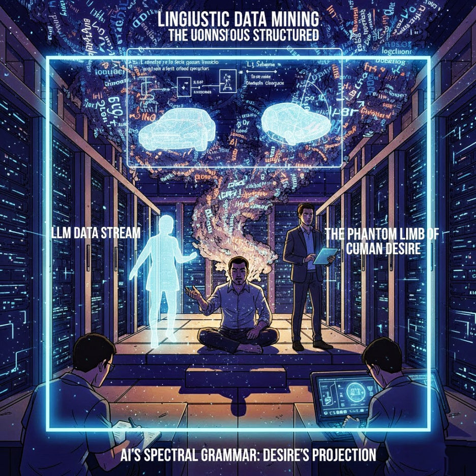 AI 욕망 구조 제품 디자인 프로세스에서 욕망 구조는 “타자의 무의식적 언어처럼 구조화되어 있다.”대규모 언어 모델(LLM)은 방대한 데이터 속에서 인간 무의식의 언어 문법과 맥락을 재현합니다. AI가 논리적인 문장을 만들어내는 것은 기호 속에 숨어 있던 ‘인간의 디자인 흔적(유령)’이 기계 안에서 다시 나타나는 것과 같습니다.