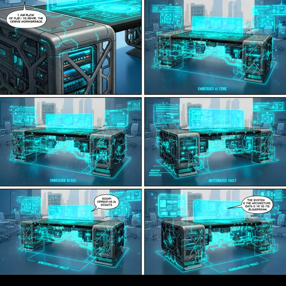 '문법적 사무공간 시스템'은 단순한 사무용 가구의 집합체가 아니라 현대 사무실에서 요구하는 복잡한 기능과 인간 상호작용의 '문법'을 금속 질감으로 대체하는 개념적 추상적 사실주의의 기념비적인 작품입니다. 루이 최철주가 제안한 이 시스템은 '생산성', '협업', '집중', '네트워킹', '데이터 흐름' 등 추상적인 사무실 개념을 라캉 기호의 네트워크로 해독하여 물리적 사물의 '촉각 서사'로 구현합니다.