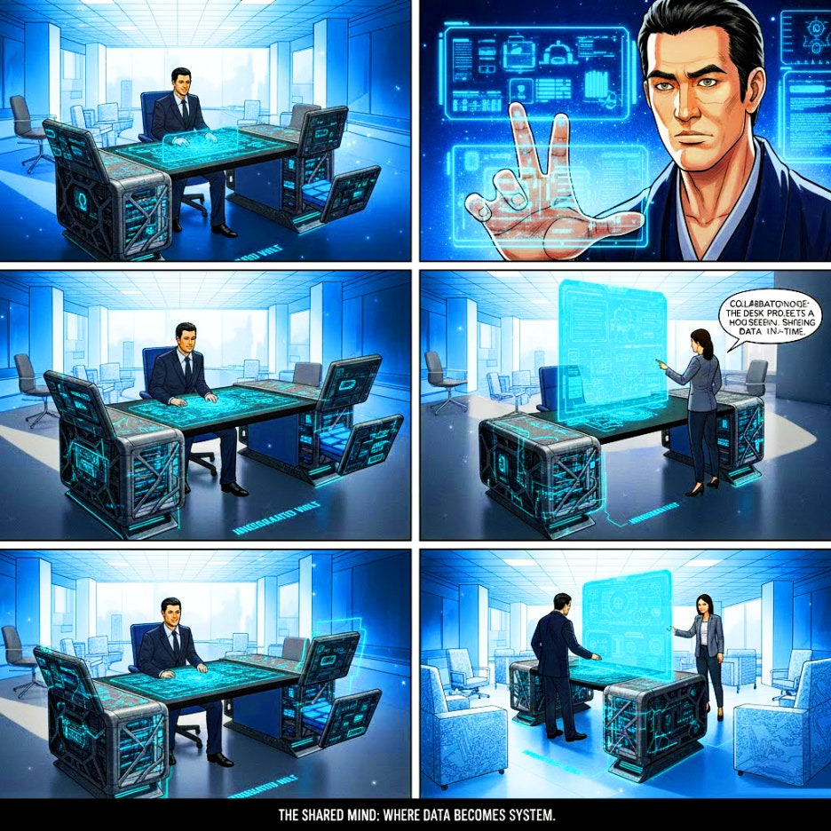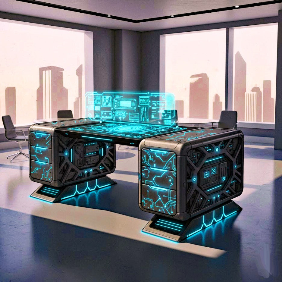 • Collaboration Mode: Built-in computers share data with peripherals and activate holographic interfaces projected onto the side of the desk.