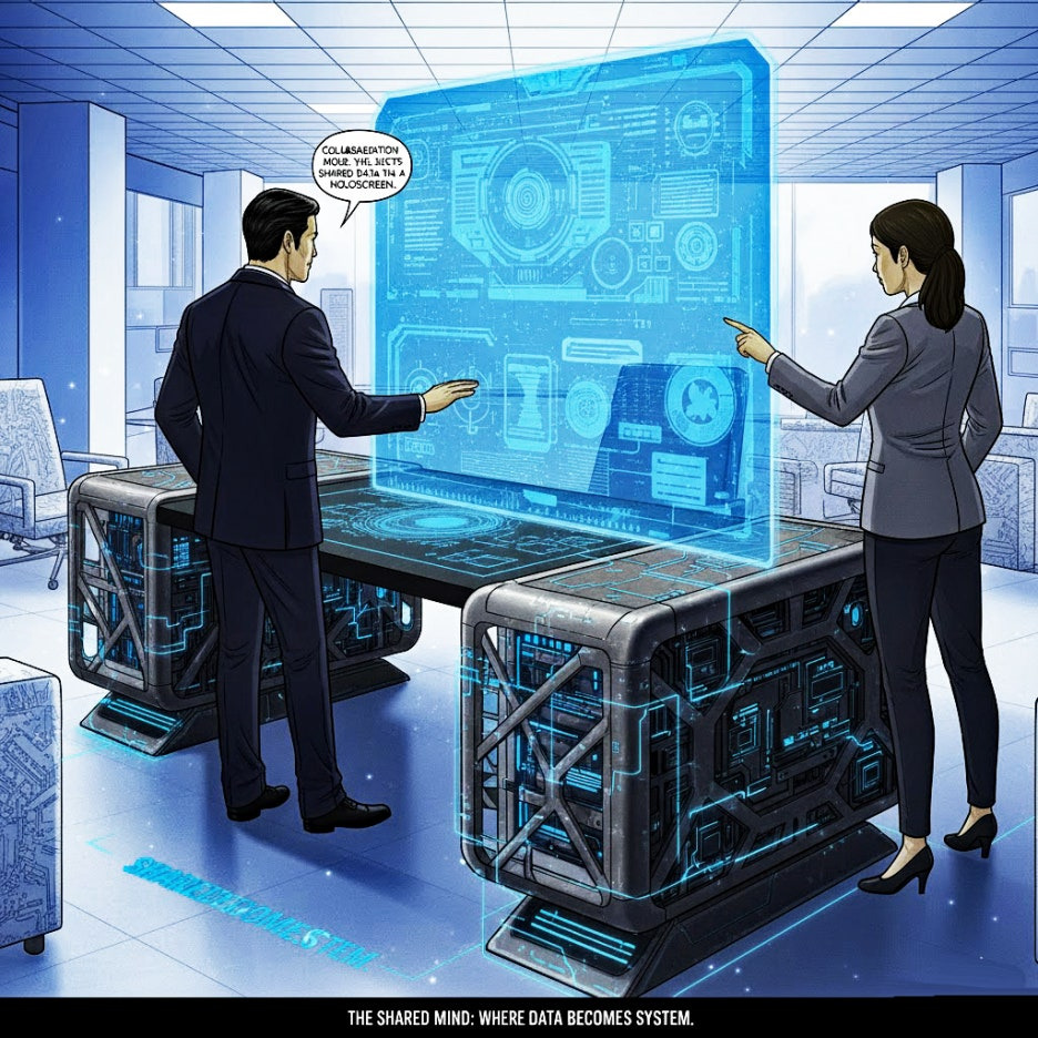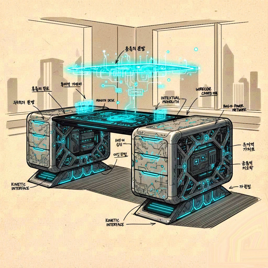 그들의 심오한 성찰은 천재적인 시스템 엔지니어 카밀 정에 의해 중단됩니다. 그녀는 최철주의 개념적 틀에서 파생된 사무용 가구에 대한 일련의 추상적인 디자인 청사진과 씨름합니다. 순수한 공학적 관점에서, 이 디자인들은 처음에는 안정성, 인체공학, 재료 응력에 대한 모든 기존 개념을 위반하는 것처럼 보입니다. 그러나 갑작스럽고 심오한 깨달음과 함께, 카밀은 그 비순응적인 형태 안에 "생산성", "협업", "집중"에 대한 인간의 근본적인 욕망이 역설적으로 인코딩되어 있음을 인식합니다. 이러한 추상적인 기능들은 데이터의 문법으로 세심하게 번역되어 독특한 건축적 청사진을 형성합니다. 중앙 홀로그램 테이블 주위에 모인 세 전문가는 AI가 제안한 개념들을 면밀히 검토하며, 알고리즘 구조 안에 내재된 인간의 운영적 서사 지문이 부인할 수 없이 존재함을 확인합니다. 최철주는 그의 특징적인 확신을 가지고, 이상적인 사무실을 위한 "디자인의 유령"이 이 "메아리"—작업의 추상적인 언어와 그것의 잠재적인 물질화 사이의 특이한 공명—안에 거주한다고 주장합니다. 그는 그들의 공동 임무를 명확히 합니다. 그것은 단순히 기존 사무실 레이아웃을 복제하는 것이 아니라, 방대한 무의식적 작업 문화 데이터 세트 안에 인코딩된 라캉적 "대타자(Big Other)"를 해독하고, 그 말 없는 필요를 유형의 "만화적 리얼(Cartoonistic Real)" 사무실 시스템으로 구체화하는 것입니다. 그는 이러한 시스템이 기능성, 미학, 그리고 작업 행위 자체에 대한 인간의 인식을 근본적으로 도전하고 궁극적으로 재정의할 것이라고 선언합니다. 일치된 결의로, 카밀은 이 추상적 개념이 물리적 현실을 얻도록 하기 위해 그녀의 공학적 역량을 모두 바치겠다고 맹세합니다. 그녀는 이상적인 작업 공간의 "유령"을 견고하고 부인할 수 없는 물리적 존재로 변모시키겠다고 다짐하며, 재료 과학 및 제조의 경계를 확장하여 현대 사무실의 말 없는 욕망을 부인할 수 없이 견고하고 기능적인 오브제로 구현합니다. "문법적 사무공간 시스템"에 대한 그들의 공동 비전이 구체화되면서, 직장 디자인의 기반 자체를 뒤흔들 준비가 된 전례 없는 도전이 모습을 드러냅니다.