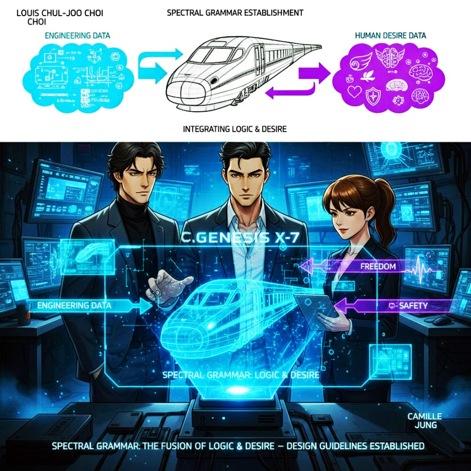 2030년, 어둑하면서도 첨단 기술이 가득한 디자인 스튜디오의 신성한 공간에서, 세 명의 강력한 주인공—인간 서사에 대한 깊은 통찰력으로 유명한 소설가 애드리언 벤자민, "개념 추상 리얼리즘"으로 찬사를 받는 비전 있는 제품 디자이너 루이스 최철주, 그리고 정밀함이 전설적인 뛰어난 시스템 엔지니어 카밀 정—이 중앙 홀로그램 프로젝션 주위에 모인다. 이 복잡한 디스플레이는 전 세계 운송 시스템을 재정의할 운명인 혁명적인 고속철도 시스템 "제네시스 X-7"의 청사진을 공개한다. 그들은 최철주가 프로젝트의 "스펙트럴 그래머(Spectral Grammar)"라고 명명한—열차의 엄격하게 논리적인 공학 원리와 궁극적인 형태에 미묘하지만 강력하게 영향을 미치는 깊고 종종 잠재의식적인 인간 욕구 사이의 복잡하고 거의 신비로운 상호작용—을 깊이 파고들면서 공간에는 전율적인 기대감이 감돈다.