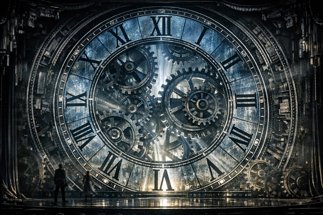 전형적인 '프로시니엄(Proscenium)' 아치 구조를 활용하되, 무대 전체를 하나의 거대한 시계 내부 기계 장치처럼 디자인합니다. 관객은 오페라하우스의 벨 에포크 양식과 대비되는 차갑고 정교한 티타늄/스틸 소재의 기계 미학을 목격하게 됩니다. The Great Altar of Time Opera stage production is also the main concept: "The Great Altar of Chronos." It utilizes a typical 'Proscenium' arch, but designs the entire stage like a giant clockwork. The audience will witness a cold and elaborate titanium/steel mechanical aesthetic that contrasts with the opera house's Belle Epoch style.