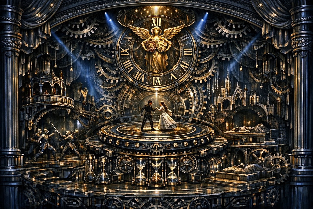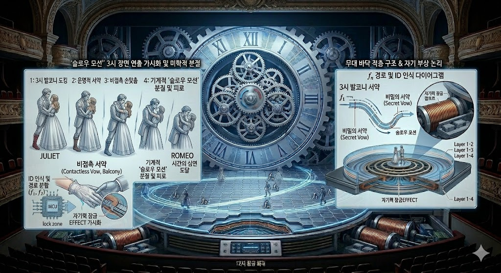 무대 미학의 완결성 (Critical Reflection)의 렌더링으로서 셰익스피어의 고전을 개념적 추상의 영역으로 끌어올립니다. 무대 위의 배우는 인간인 동시에 시스템의 일부인 '오토마타'로 기능하며, 이는 라캉적 상징계에 갇힌 인간의 실존적 한계를 상징합니다. 특히, '플로팅 도킹' 시스템에 의해 지면에서 떠오른 연인들의 모습은 중력(현실의 제약)을 거부하는 욕망의 발현이며, 줄리엣이 시계 바늘 위로 쓰러지는 '정지된 시간'의 구원은 기계적 완결성이 도달한 순수 추상의 아름다움, 즉 "정지된 시간의 구원"을 목격하게 될 것입니다. 이는 현대 추상 예술이 지향하는 "기계적 완결성을 통한 인간 욕망의 역추적"이라는 고도의 개념적 성취를 의미합니다.