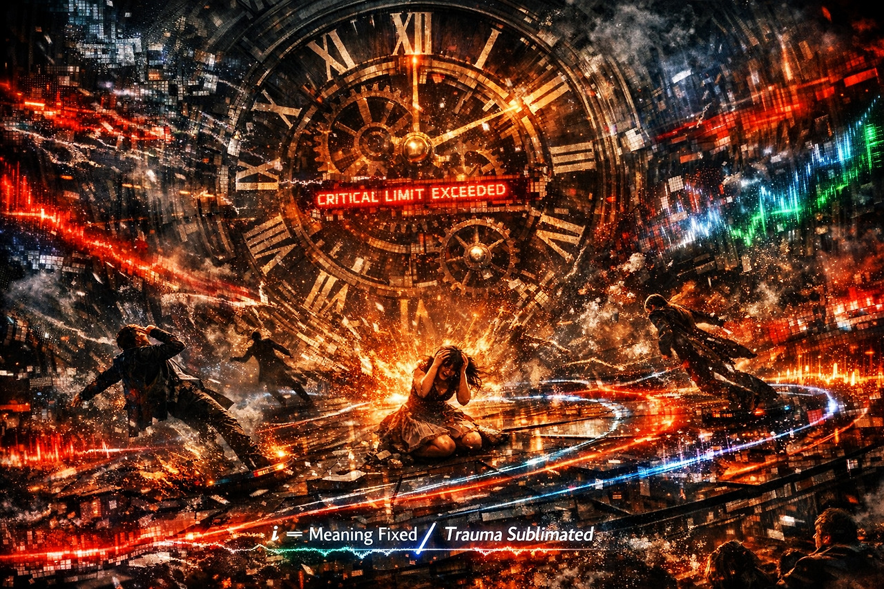 $I...I'$ (Image Transformation) → $V_{desire}$: 고착된 $I$를 타격하는 리비도적 에너지의 속도입니다. 이는 사운드의 주파수($Hz$)를 결정하며, 속도가 빠를수록 고주파의 날카로운 파열음이 발생합니다.