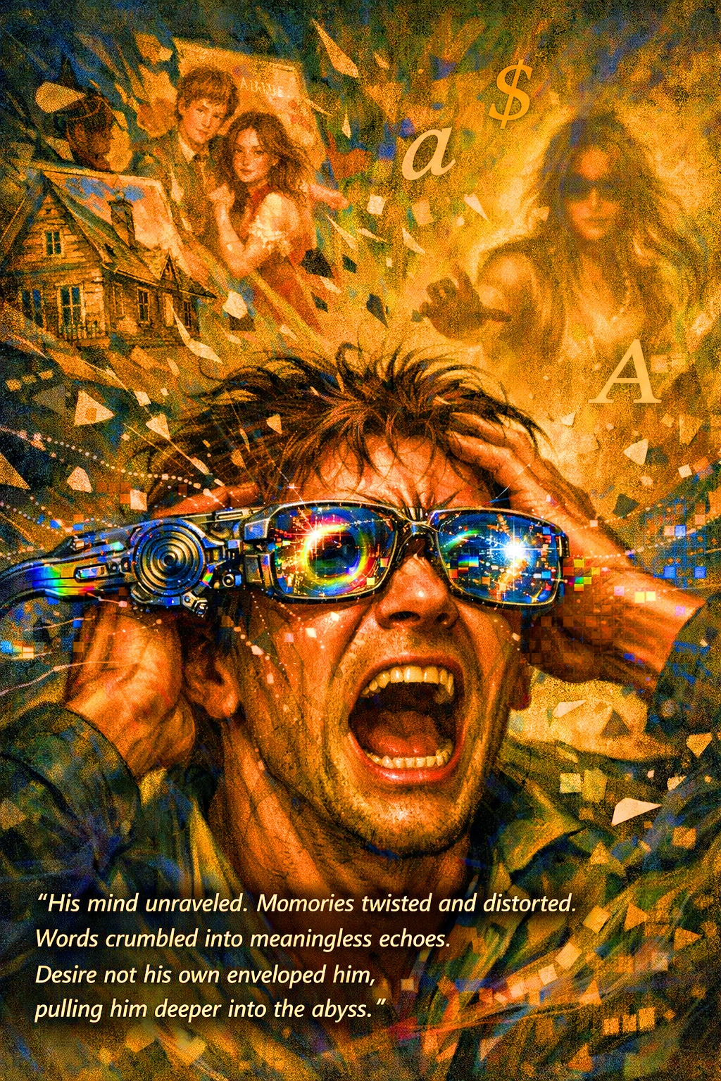 -부유하는 부품들 : 안경 주변에 떠다니는 안테나, 와이어, 추상적 전자 요소들이 물리 법칙을 벗어난 유령적 구조를 암시합니다.