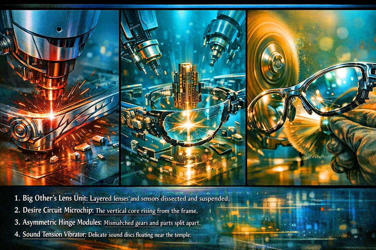 그 공백이 바로 '대타자의 응시'가 머무는 곳입니다, 카밀. AI는 소리(전화)와 시선(안경)이 만나는 지점에서 언어가 붕괴되는 순간을 포착한 거예요. 이 부품은 어떤 공학적 기능도 수행하지 않아요. 하지만 이 기하학적 불균형이 안경 전체의 시각적 긴장감을 완성하고 있죠. 이건 공학이 아니라 추상화의 실체화예요.